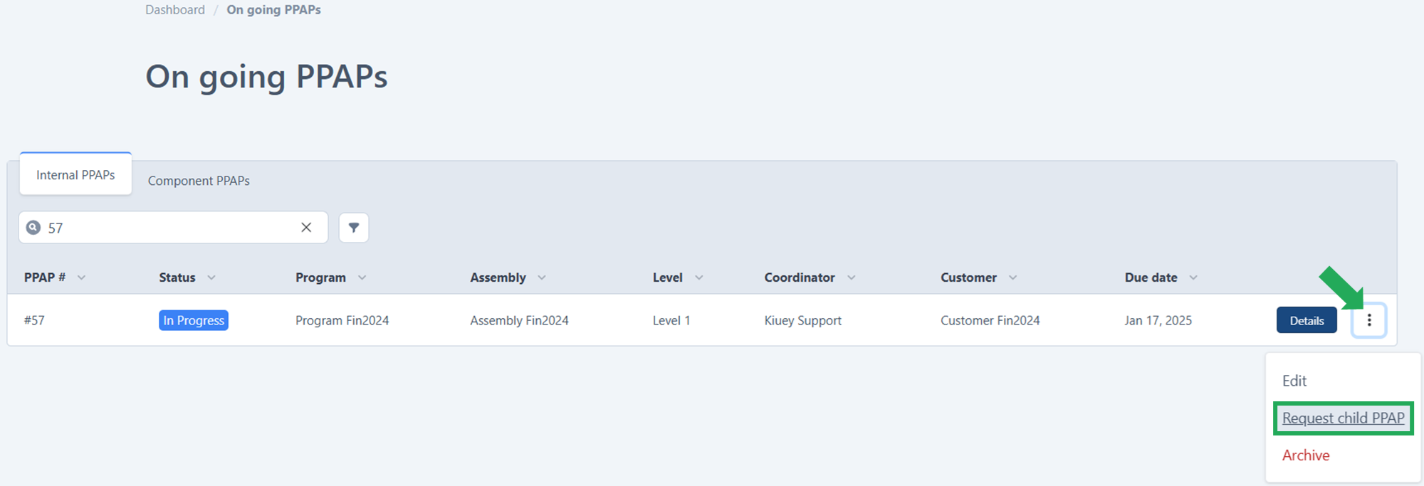 1. Click on the three-dot button located next to the PPAP, then click on Request child PPAP.