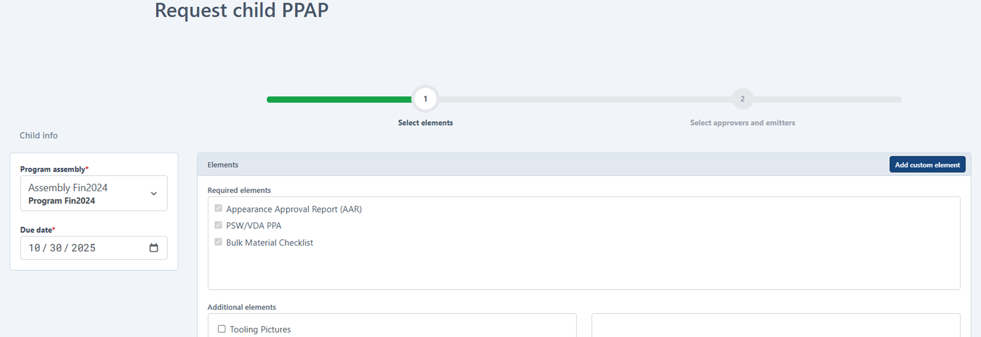 2. Choose Child PPAP information (Program assembly, due date, additional/custom elements), then click Next.
