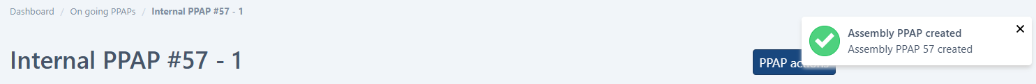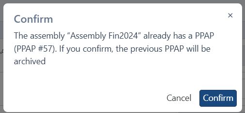 4. If the assembly already has a PPAP, the previous PPAP will be archived. A warning will appear to confirm if you would like to proceed. If confirmed, the previous PPAP will automatically be archived, and the child ppap will be created.