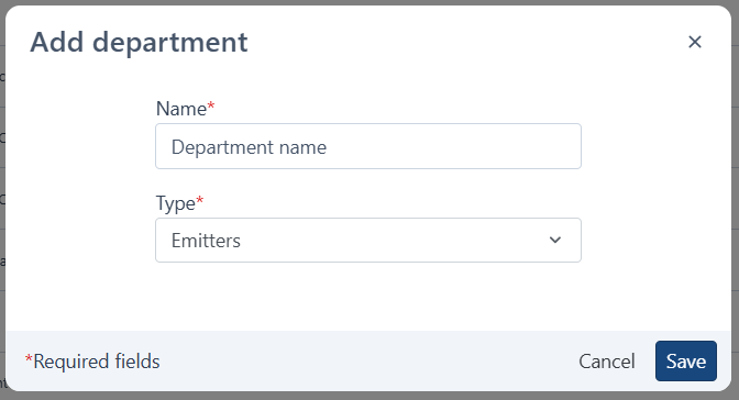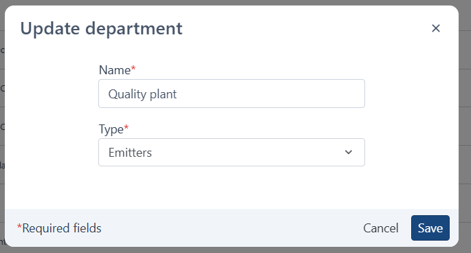 - Here, you can update the Name or Type (Emitter/Approver of the element) for the department.